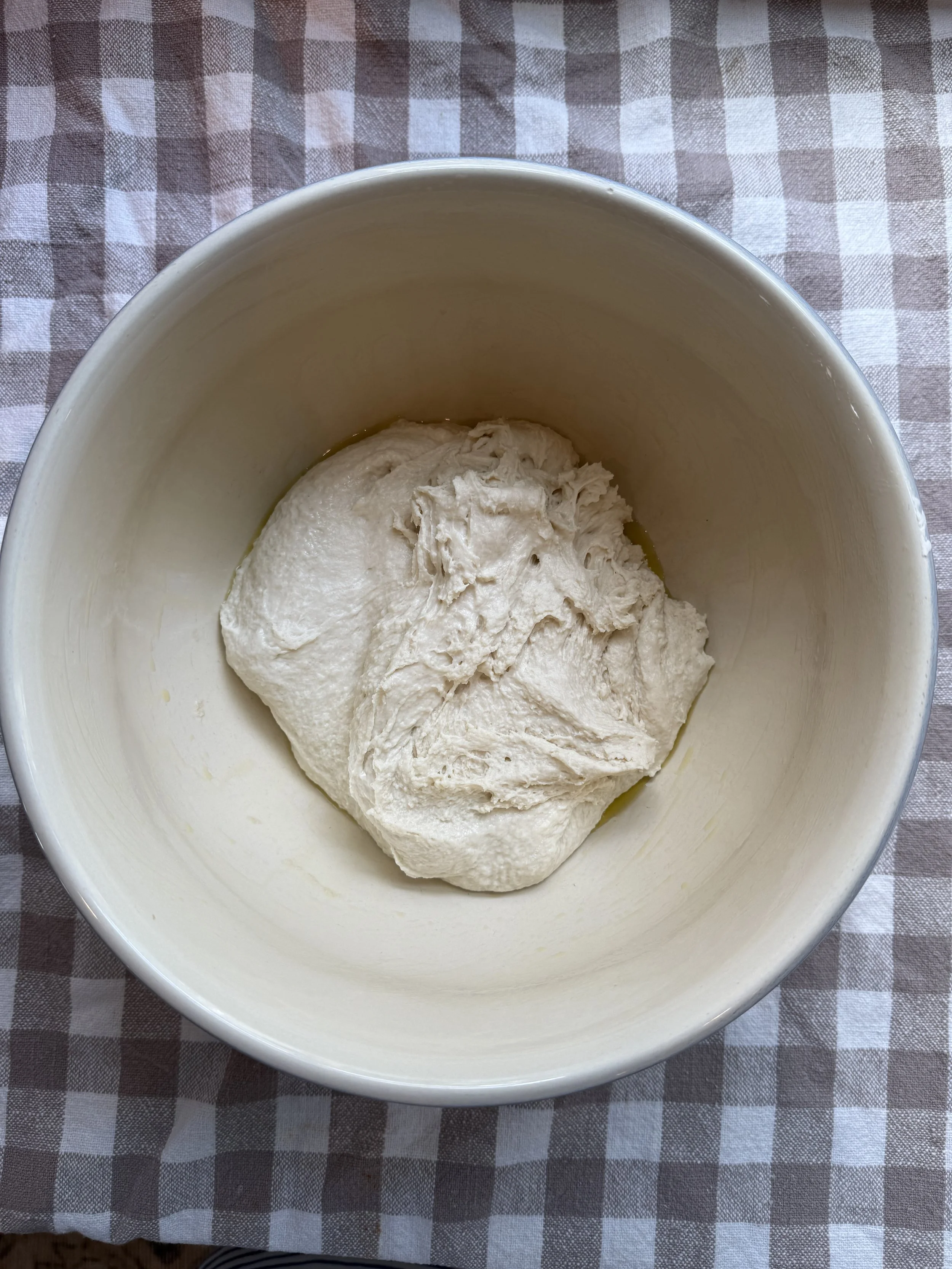 Transfer the dough to a large clean bowl lightly coated with olive oil. Cover the bowl tightly with plastic wrap or a clean kitchen towel.